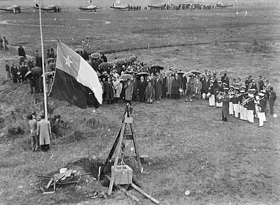 Vista parcial de las primeras aeronaves que llegaron a la inauguración de la pista de aterrizaje del aérodromo Gamboa en la ciudad de Castro en el año 1946.